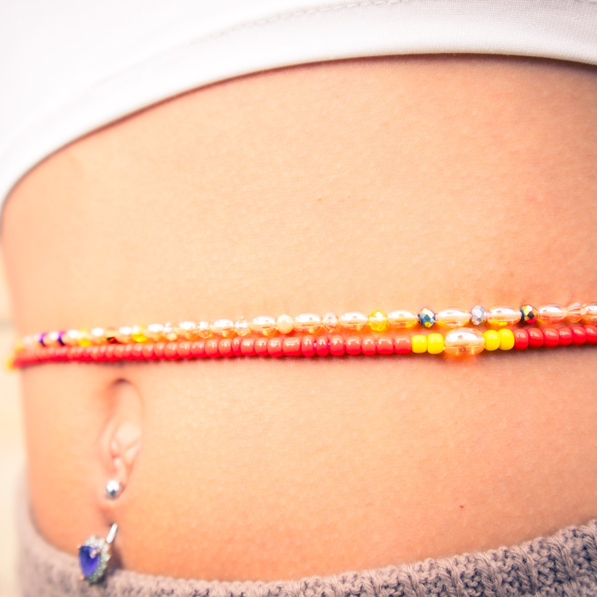 A fiery two-strand waist bead set in red and gold tones made to ignite confidence, self-love, and bold expression.